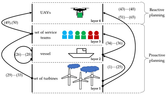 In the structure of the modeled system, four layers can be distinguished: WTs, vessels, service teams, and UAVs (see Figure 4). These layers interact with each other. For example, the location of the WTs (layer 1) determines the vessel’s acceptable sailing routes (layer 2), which in turn determine the possible service team assignments and the schedule for WT servicing (layer 3). The adopted service schedule affects the plan for equipment delivery by UAVs (layer 4), which is also dependent on the weather conditions prevailing at sea (layer 1). These relationships are distinguished by the declarative model presented below.