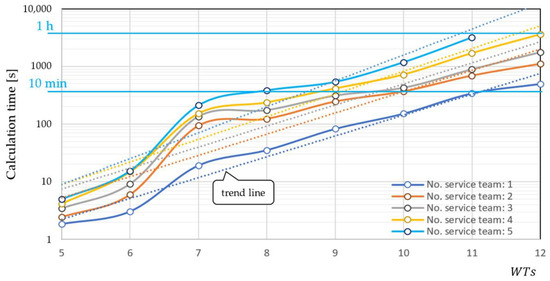 It is required that all turbines of the set undergo service within 1 working day, i.e., that the duration of the entire mission does not exceed (each WT can be serviced by any of the service teams, i.e., a subset of the set ).