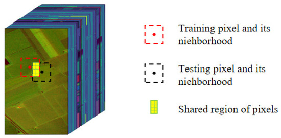Most of the existing HSI classification methods are patch-based methods that use the label of the center pixel to indicate the category of the image patch [14] as shown in Figure 1a. There are two drawbacks to these methods. Firstly, if there is no overlap in image block partitioning, only the pixel label values at the center of the image block are involved in model training, and a large amount of label information in the neighborhood is wasted. Meanwhile, the spatial information of the pixels inside the image block is ignored. These are very unfavorable to the classification results. Secondly, if there is overlap in image block partitioning, serious information leakage may occur, as shown in Figure 2. There is a part of sharing region between adjacent blocks; if these image blocks are divided into training data and test data separately, then the training data information leaks into the test data, resulting in inflated test results.