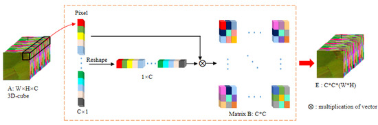 where is the multiplication of the vector, and the value of the matrix indicates a weighting with other spectral bands. Obviously, the matrix is symmetrically distributed, with the maximum value on the diagonal. the above operation is repeated, and we can convert the HSI data from spatial–spectral dimensions to spectral correlation spatial dimensions. The data size is converted from to . Meanwhile, as the hyperspectral data change, we also reshape the corresponding label vector into .
