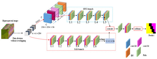 Recently, the 1D, 2D, and 3D CNNs have been utilized to extract various kinds of HSI features via multiple non-linear transformation architectures [17]. Li [18] used two 2-D CNN networks to extract spatial, local spectral, and global spectral information at the same time. In addition, the SE structure [11] was applied to enhance the feature extraction capability of the two streams. Zou proposed an architecture with two FCNs for HSI classification based on 3-D and 1-D FCNs [19]. The 3-D branch extracted the spatial–spectral information, and the 1-D branch extracted the spectral information as a supplement. However, we only extracted local spectral features and ignoreed the non-adjacent spectral features.