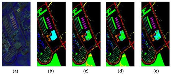 (2) Reflective Optics System Imaging Spectrometer (ROSIS) dataset: Pavia University. The size of the image is 610 × 340, and it contains 103 bands and nine classes. The false-color image and ground-truth of Pavia University are shown in Figure 7a,b.