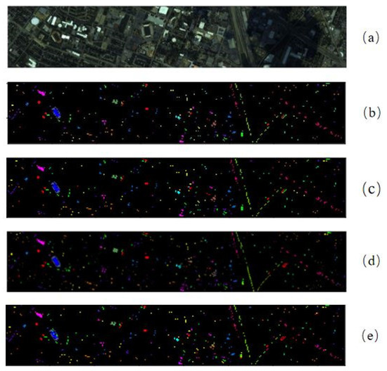 (3) ITERS-CASI dataset: Houston University. It is over the University of Houston and the neighboring urban area. The data size is 349 × 1905 and contains 144 bands in the spectral range from 364 nm to 1046 nm. It has 15 classes. The false-color image and ground-truth of Houston University are shown in Figure 8a,b.