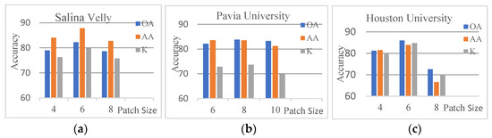 Influence of the patch sizes on OA, AA, and Kappa(K). (a) Salina Velly; (b) Pavia University; (c) Houston University.