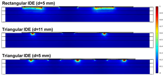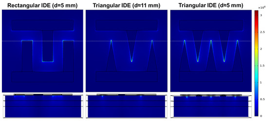 The electric field distribution in the rectangular and triangular IDEs was evaluated as shown in Figure 4. The top panel shows the electric field distribution in the x-y plane view and the bottom panel shows the y–z cross-sectional view. The electric field was strongly focused on the edge of the rectangular IDE (d = 5 mm), and the maximum electric field was about 1.09 × 106 V/m. For the triangular IDE, a strong electric field was observed at the tip region, and the maximum magnitudes were about 2.54 ×106 V/m at d ≈ 11 mm and 3.17 × 106 V/m at d ≈ 5 mm. Compared to the triangular IDEs with a d ≈ 11 mm, the triangular IDEs with a d ≈ 5 mm had a smaller effective electrode spacing, so the magnitude of the electric field appears larger.