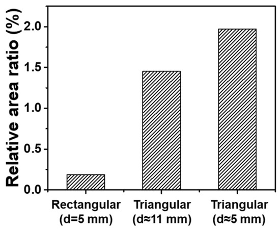 Figure 5 shows the distribution of PEI calculated from Equation (7) for the rectangular IDE (d = 5 mm), triangular IDE with three fingers (d ≈ 11 mm), and triangular IDE with five fingers (d ≈ 5 mm). From these results, a relative area ratio of PEI > 0.90 was calculated. The relative area ratio of PEI was defined as the ratio of the valid area of PEI > 0.90 to the total cross-sectional area. Figure 6 shows a comparison of the relative area ratio of PEI in rectangular IDEs (d = 5 mm), triangular IDEs with three fingers (d ≈ 11 mm), and triangular IDEs with five fingers (d ≈ 5 mm). The relative area ratios of the rectangular IDE (d = 5 mm), triangular IDE with three fingers (d ≈ 11 mm), and triangular IDE with five fingers (d ≈ 5 mm) were 0.18%, 1.45%, and 1.97%, respectively. The relative area ratio of the triangular IDEs with five fingers increased around 10 times compared to that of the conventional rectangular IDEs at the same electrode distance.