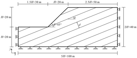 In actual engineering, the height of steep cataclastic rocky slopes without reinforcement was not likely to be too high, therefore, the slope (height H = 20 m) was assumed in this paper. According to the research results of Zhang et al. [] on the calculation accuracy of the safety coefficient of slope stability, the two-dimensional calculation model was determined as shown in Figure 1. The left boundary of the calculation model was 1.5 H from the toe of the slope, the right boundary was 2.5 H from the shoulder of the slope, and the bottom of the slope extends downward by H. The slope angle β was 45°. Calculation model boundary conditions were: the bottom boundary of the slope was a fixed constraint, the left and right boundaries were constraints in the normal direction, and the ground surface of the slope was a free boundary. The calculation model consists of cataclastic rock mass and muddy interlayer; the dip angle of the interlayer was θ. Both cataclastic rock mass and muddy interlayer were simulated by solid unit, and the thickness of the interlayer was 0.05 m. In order to improve the calculation accuracy, the cell size was set to the minimum value specified by the calculation program. Both the cataclastic rock mass and the muddy interlayer are considered as ideal elastoplastic materials, and the yield criterion was adopted as the conventional Mohr–Coulomb yield criterion. The Mohr–Coulomb criterion can be expressed in terms of the invariants , , and , as shown in Equation (3):