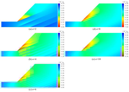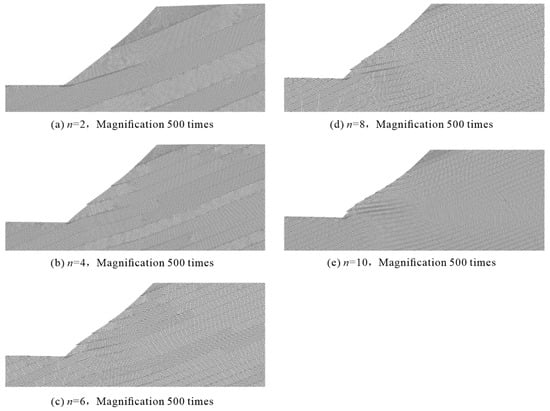 The horizontal displacement clouds (Figure 2) of the focal area of the bedding cataclastic rock slope containing multi-muddy interlayers showed the following five features: (1) The horizontal displacement of the slope was mainly negative, and only the local area was positive; (2) The absolute value of horizontal displacement near the foot of the slope was larger than that of the shoulder of the slope; (3) The absolute value of horizontal displacement of each cataclastic rock layer between the interlayer decreased gradually from the slope face to the top of the slope; (4) There were abrupt changes in the horizontal displacement clouds of the rock bodies on the upper and lower sides of the muddy interlayer, and abrupt changes from the slope face to the top of the slope became weaker and weaker, indicating that the rock bodies on both sides produced relative slip along the interlayer, and the relative slip from the proslope end of the interlayer to the top of the slope, and from the toe of the slope to the shoulder of the slope, became smaller and smaller; and (5) The maximum value of the absolute value of the horizontal displacement of the slope did not necessarily appear at the toe of the slope. When n was one or two layers, it appeared at the toe of the slope, and when n was more than two layers, it appeared at the position of the intersection of the second layer of the interlayer layer and the slope surface. The above analysis showed that the bedding cataclastic rock slope containing multi-muddy interlayers underwent multi-layered relative slip along the interlayer, and the relative slip gradually decreased from the toe to the top of the slope.