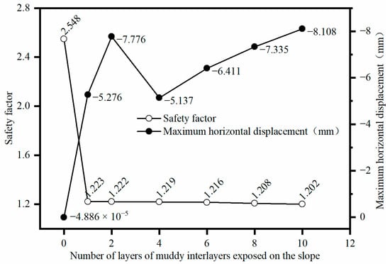 Figure 4 shows the relationship among the safety factor of the slope, the maximum horizontal displacement, and the number of layers of muddy interlayers exposed on the slope. When there was no interlayer, the maximum horizontal displacement of the slope was −4.886 × 10−5 mm; when there was only one layer of interlayer at the toe of the slope, the maximum horizontal displacement increased to −5.276 mm; when there was two layers of interlayer, the maximum horizontal displacement increased to −7.776 mm; and when there was four layers of interlayer, the maximum horizontal displacement decreased to −5.137 mm. When the interlayer increased from 4 to 10 layers, the maximum horizontal displacement slowly increased again to −8.108 mm. The maximum horizontal displacement generally increased with the number of layers of the interlayer. The slope safety factor decreased rapidly from 2.548 to 1.223 for the muddy interlayers from 0 to 1 layer, and slowly decreased to 1.202 for the increased interlayer from 1 to 10 layers. The overall safety factor decreased as the number of layers of interlayer increased, and the decisive influence on the safety factor of the slope was the muddied interlayer through the toe of the slope.