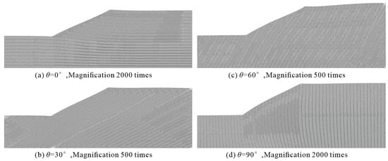 The grid deformation of the bedding cataclastic rock slope containing multi-muddy interlayers, with different dips of cis-fragmented rocky slopes at slope angle β = 30°, showed that the slope deformation damage was mainly rock bending deformation, and there was no slippage. Figure 5 gives the grid deformation diagram of the slope when the dip angle θ was 0°, 30°, 60°, and 90°.