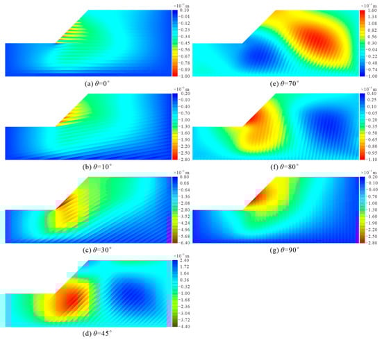 For the slope with slope angle β = 45°, when the dip angle θ of the muddy interlayers was 0° (Figure 6a), the horizontal displacement of the slope was mainly negative, and the horizontal displacement had abrupt changes along the interlayer, indicating the relative slip of the rock layer. For each cataclastic rock mass, the horizontal displacement at the bottom of the layer was significantly larger than at the top of the layer, and the relative slip phenomenon became weaker and weaker from the toe to the shoulder of the slope and from the face to the inside of the slope. When the dip angle θ of the muddied interlayer increased to 10° (Figure 6b), the overall characteristics of the horizontal displacement diagram of the slope were not significantly different from those at 0°, excepted that the maximum value of the absolute value of horizontal displacement in the X-negative direction increased by 167%, indicating that the tendency of the slope to slide toward the prograde was enhanced. θ increased from 10° to 45°, the number of layers of muddy interlayers exposed on the slope surface gradually decreased, and the horizontal displacement diagram of the slope showed the following three characteristics: (1) The maximum value of the absolute value of the horizontal displacement increased first and then decreased, with a maximum value at 25°; (2) The relative slip phenomenon between the layers was weak to strong and then decreased, with the most significant relative slip at 25°, the slip at 30° occurring mainly in the muddy interlayers through the toe of the slope (Figure 6c), and basically no relative slip in the rock layers at 45° (Figure 6d); (3) The horizontal displacement of the underlying rock layer at the toe of the slope gradually increased, and the uplift of the foot of the slope gradually became obvious. θ increased from 45° to 80°, the dip angle of the rock layer became steeper and steeper, the self-stability of the fractured rock layer was poor, and the displacement in the X-positive direction started to appear on the shoulder of the slope, and it showed a change pattern of increasing and then decreasing. And the displacement of the toe of the slope to the X negative direction and the maximum value of its absolute value showed a trend of decreasing and then increasing (Figure 6d–f). θ increased from 80° to 90°, the displacement of side slope X in the positive direction decreased, the absolute value of displacement in the negative direction increased, the displacement contour was circular, and the sliding trend of the side slope toward the critical surface was more significant (Figure 6g).