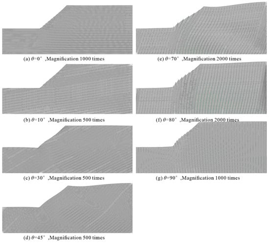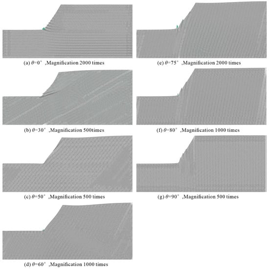 In a comprehensive analysis of horizontal displacement (Figure 9) and grid deformation (Figure 10) of β = 60° slope, the slope deformation damage exhibited the following laws: (1) When θ was 0° (horizontally bedding rocky slope), the slope was “compression-shear” failure (Figure 10a); (2) θ in the range of (0°, 50°), the slope was “traction-sliding” failure (Figure 10b,c); (3) θ in the range of (50°, 80°), the slope rock mainly deformed in deflection (Figure 10d–f); and (4) θ in the (80°, 90°) zone, “bending-buckling-collapse” failure occurred on the slope (Figure 10g). Compared with the slope with β = 45°, the slope with β = 60° had no “traction-sliding-bending-shear” failure.