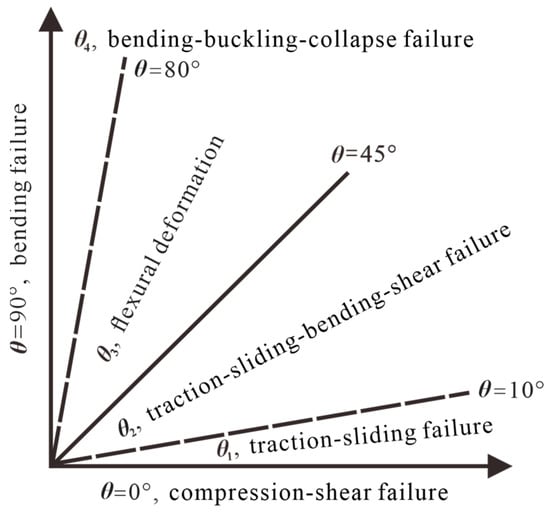 In a comprehensive analysis of horizontal displacement (Figure 6) and grid deformation (Figure 7) of β = 45° slope, the slope deformation failure exhibited the following laws: (1) When θ was 0° (horizontally bedding rock slope), the slope was compression-shear failure, i.e., under the action of its own gravity, the vertical pressure and horizontal pressure increased with depth, the compression-shear phenomenon became more obvious with increasing depth, and the shear-out displacement of the toe of the slope was the largest (Figure 7a); (2) θ in the range of (0°, 10°), the slope was damaged by “traction- sliding”, and the relative slip increased gradually from the shoulder to the toe of the slope, and the potential shear outlet location was the muddied interlayer through the toe of the slope (Figure 7b); (3) θ in the (10°, 45°) zone, the slope was damaged by “traction-sliding-bending-shear”, with uplift-bending deformation of the underlying rock layer at the toe of the slope and simultaneous slip and uplift-bending deformation of the exposed rock layer on the slope surface, especially the rock layer near the toe of the slope (Figure 7c); (4) θ in the range of [45°, 80°), the slope rock layer mainly deformed in flexure, the shoulder of the slope dipped and deformed towards the back of the slope, while the toe of the slope rose towards the surface (Figure 7d). Similar to the principle of a cantilever beam, the length of the cataclastic rock layer near the toe of the slope was short and the dumping deformation toward the back of the slope was small, while the length of the cataclastic rock layer on the shoulder of the slope was long and the dumping deformation was large, so the rock layer on the slope was separated along the muddy interlayers due to uncoordinated deformation (Figure 7e), and a tension zone was formed in the interlayer; and (5) θ was in the interval of [80°, 90°], the slope was damaged by “bending-buckling-collapse”, i.e., by the action of the slope thrust. When θ was 80°, the fractured rock layer at the toe of the slope was nearly upright, and the collapse may have occurred (Figure 7f), while when θ was 90°, the rock layer in the middle of the slope was deformed by bending, while the rock layer at the lower part (toe of the slope) was deformed by bending-buckling and collapsed to the prograde, and the tendency of the slope to collapse disaster was more obvious (Figure 7g). In a similar computational model by Zhang et al. [], θ increased from 0° to 90° and the slope damaged modes were compression-shear failure, sliding-tensioning failure, sliding-splitting failure, bending-buckling failure, and collapse failure, in that order. In contrast to their study, traction-sliding-bending-shear failure and flexural deformation also occurred in bedding cataclastic rock slope containing multi-muddy interlayers. The relationship between slope failure modes and dip angle θ of the muddy interlayers in the rocky slopes is shown in Figure 8.