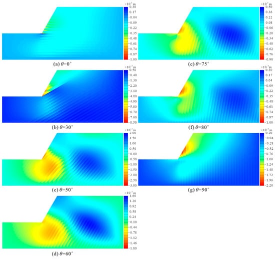 For the slope with slope angle β = 60°, when the dip angle θ of the muddy interlayers was 0° (Figure 9a), the horizontal displacement of the slope was dominated by negative values, and the horizontal displacement had abrupt changes along the interlayer, indicating the relative slip of the rock layer. For each cataclastic rock layer, the horizontal displacement at the bottom of the layer was significantly larger than at the top of the layer, and the relative slip phenomenon became weaker and weaker from the toe to the shoulder of the slope and from the face to the inside of the slope. θ increased from 0° to 50°, the number of layers of the exposed interlayer on the slope surface gradually decreased, and the horizontal displacement diagram of the slope exhibited the following two characteristics: (1) The maximum value of the absolute value of the horizontal displacement increased first and then decreased, with a maximum value at 40°; and (2) The relative slip phenomenon was weak to strong and then weakened, with the most significant relative slip phenomenon at 30° (Figure 9b), slip above 40° occurring mainly in the muddy interlayers through the toe of the slope, and slip weakening at 50° (Figure 9c). θ increased from 50° to 80°, the dip angle of the rock layer became steeper and steeper, the self-stability of the cataclastic rock layer was poor, and the displacement of the shoulder of the slope starts to appear in the X-positive direction, while the displacement of the toe of the slope went in the X-negative direction, and the maximum value of its absolute value showed a trend of first decreasing and then increasing (Figure 9d–f). θ increased from 80° to 90°, the absolute value of displacement in the negative direction of the slope increased, the displacement contour was circular, and the trend of sliding of the slope became more significant (Figure 9g).