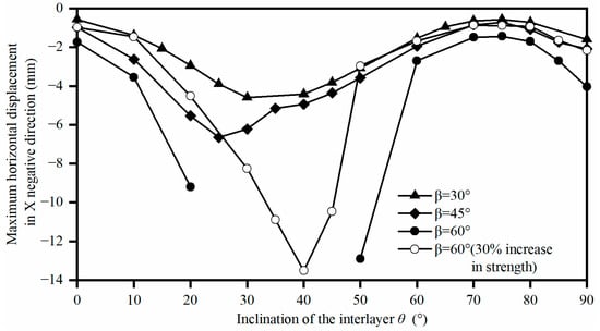 The relationship between the maximum horizontal displacement in the X-negative direction of the slope and the inclination angle θ of the interlayer is given in Figure 11, which shows the following five features: (1) θ increased from 0° to 90°, the horizontal displacements of the bedding cataclastic rock slope of the four calculation schemes showed the same pattern of change, i.e., first increasing, then decreasing, then increasing; (2) β = 30°, the θ of the horizontal displacement maximum was 30°, β = 45°, the θ of the horizontal displacement maximum was 25°, and β = 60° (30% increase in strength), the θ of the horizontal displacement maximum was 40°; (3) The horizontal displacement of upright laminated slopes was greater than that of the horizontally laminated slopes; (4) Overall, the horizontal displacement of steeply bedding rock slope was smaller than that of gently bedding rock slope; and (5) The slope angle β increased and the horizontal displacement increased.