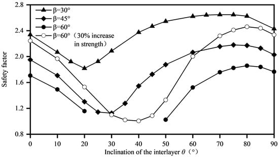 The relationship between the slope safety factor and the dip angle θ of the mezzanine is given in Figure 12, which shows the following five features: (1) θ increased from 0° to 90°, the safety coefficients of the four calculation schemes showed the same pattern of change, i.e., first decreasing, then increasing, then decreasing; (2) θ for the minimal value of safety factor was 20° when β = 30°, θ for the minimal value of safety factor was 30° when β = 45°, and θ for the minimal value of safety factor was 40° when β = 60° (30% increase in strength); (3) The safety factor of upright bedding slope was slightly greater than that of horizontal bedding slope; (4) In general, the safety factor of steeply bedding rock slope was greater than that of gently bedding rock slope; and (5) The safety factor decreased as the slope angle β increased, and the θ corresponding to the very small value of the safety factor increased. The above conclusions are consistent with Zhang et al. [].