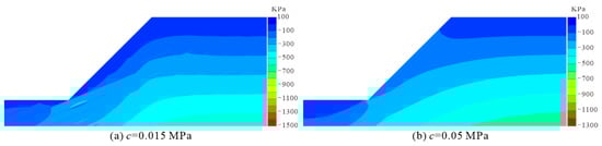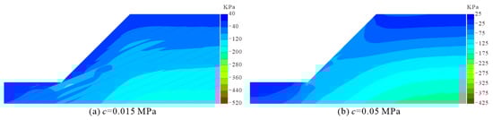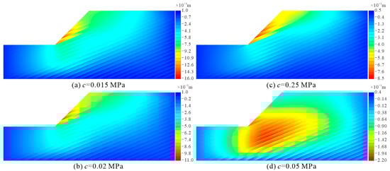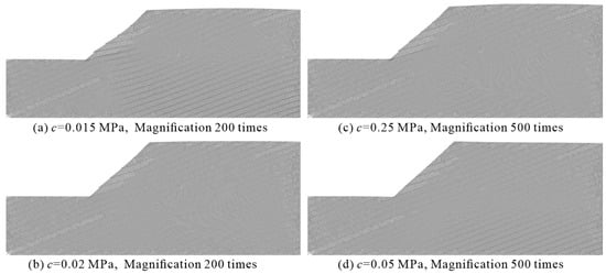 The cohesion c of the muddy interlayers increased, the stress concentration phenomenon of the maximum principal stress and maximum shear stress of the slope weakened, the stress contours became smoother and smoother (Figure 13 and Figure 14), and the maximum shear strain gradually decreased (Figure 15). The grid deformation diagram showed (Figure 16) that c increased from 0.015 to 0.02 MPa (Figure 16a,b), the slope was dominated by traction-slip damage, and the relative slip gradually decreased, and when c increased to 0.025 MPa (Figure 16c), the slope underwent traction-sliding-bending-shear failure, after which the uplift bending and relative slip weakened as c increased (Figure 16d). Figure 17 shows that the cohesion c of the muddied interlayer increased from 0.015 MPa to 0.05 MPa, the maximum horizontal displacement first decreased rapidly and then decreased slowly, the slope safety factor increased linearly from 0.95 to 1.6, and the slope stability gradually increased.