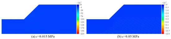 Scheme 3: An analysis of the effect of cohesion c of multi-muddy interlayer on the stability of bedding cataclastic rock slope. The interlayer was arranged from the toe of the slope, the inclination angle of the interlayer θ was taken as 22°, and the spacing d was taken as 2 m. The material parameters are shown in Table 1, where the internal friction angle of the muddied interlayer was taken as 16° and c was taken as 0.015 MPa, 0.02 MPa, 0.025 MPa, 0.03 MPa, 0.035 MPa, 0.04 MPa, 0.045 MPa, and 0.05 MPa, respectively, i.e., there were eight arithmetic cases in this scheme.