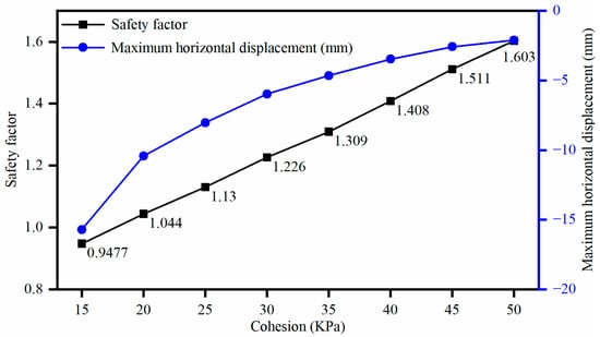 Relationship between slope safety factor, maximum horizontal displacement, and cohesion of muddy interlayers.