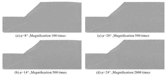 Similarly to the influence of the cohesion c of the muddy interlayers, the stress concentration phenomenon of maximum principal stress and maximum shear stress in the slope was weakened by increasing the angle of internal friction angle φ, the stress contour became smoother and smoother, and the maximum shear strain gradually decreased. The horizontal displacement diagram of the slope (Figure 18) exhibited the following characteristics: (1) Horizontal displacement was mainly in the X negative direction, the angle of internal friction angle φ increased, the maximum value of the absolute value of horizontal displacement gradually decreased, and the maximum position was always in the second layer of the mezzanine; and (2) When φ decreased, the sudden change in displacement between the exposed rock layers on the slope surface and between the underlying rock layers on the slope body was not strong, but the sudden change in displacement between the exposed rock layers on the slope surface and the underlying rock layers on the slope body was strong. When φ increased, the displacement mutation between the exposed rock layers on the slope surface and between the underlying rock layers on the slope body was enhanced, but the displacement mutation between the exposed rock layers on the slope surface and the underlying rock layers on the slope body was weakened. There was no uniform law on the influence of φ on the slope deformation damage law, as shown in Figure 18. When φ was 8°, the slope showed traction-slip damage (Figure 19a), when φ increased to 14°, the slope showed traction-sliding-bending-shear failure (Figure 19b), when φ increased to 20°, the slope was again traction-slip damage (Figure 19c), and when φ increased to 24°, the slope again showed traction-sliding-bending-shear failure (Figure 19d). Figure 20 shows that the internal friction angle φ of the muddy interlayers increased from 8° to 30°, and the maximum horizontal displacement first decreased rapidly, then decreased slowly and tended to 0. The slope safety factor increased linearly from 0.89 to 1.83, and the slope stability gradually improved.