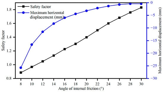 Relationship between slope safety factor, maximum horizontal displacement, and internal friction angle of muddy interlayers.
