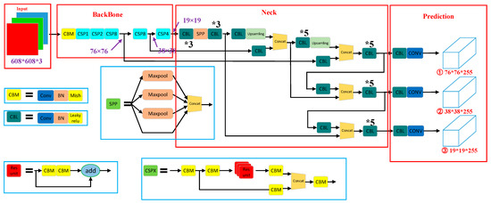 The YOLOv4 algorithm is a single target detection algorithm that does not generate candidate regions for direct classification and regression, and its network structure is shown in Figure 1. YOLOv4 consists of four parts: the input, backbone network, neck network, and prediction. The network model structure is shown below: the input was processed by mosaic data enhancement; the Backbone was selected with the CSPDarknet53 backbone network to extract features, and three effective feature layers were generated for prediction and regression analysis. The CSPDarknet53 network structure was used to reduce the computational bottleneck and memory cost, ensure its model accuracy, and improve CNN’s learning ability for model training. The feature maps extracted by the backbone network were input to the neck network neck. The SPP module and FPN [34] + PAN feature pyramid were integrated. The network Prediction was performed on the three effective feature layers to generate the final prediction frame.