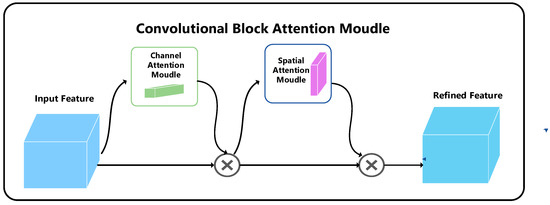 In order to cope with the complex and harsh environment under the mine and improve the feature extraction capability, the spatial and channel attention mechanisms were inserted into the three effective feature layers of the improved YOLOv4 model’s backbone output, and its network structure is shown in Figure 5.