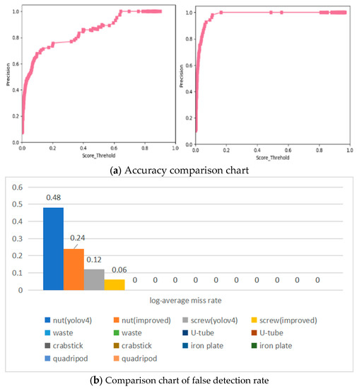 In order to verify the performance of this model, we used the YOLOv4 algorithm and this improved algorithm to train foreign object data sets, and the comparison results of the accuracy and loss rate are shown in Figure 8. Figure 8a,b shows the YOLOv4 algorithm on the left and the improved algorithm in this paper on the right.