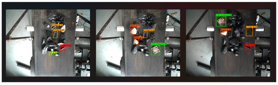 In order to verify the performance of the model and show the superiority of our algorithm in complex environments, we used YOLOv4 and this algorithm to train on the conveyor belt gangue dataset under the same environment and experimental conditions; the test results are shown in Table 5 below. The GhostNet-CBAM-YOLOv4 model improved the average accuracy by 6.1%, the precision and recall by 5.2% and 4.3%, respectively, and the detection speed by 6.1 fps compared with the original model. The test results of the conveyor belt gangue dataset in the model of this paper are shown in Figure 10.