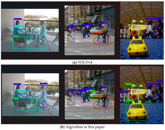 In order to verify the performance of this model, we used YOLOv4 and this algorithm to train the VOC2007 and VOC2012 data sets under the same environment and experimental conditions. The test results are shown in Table 6. The data in the table show that the average precision of the GhostNet-CBAM-YOLOv4 model was 8.5% higher than that of the original model, the accuracy and recall rate were 9.1% and 7.4% higher, respectively, and the detection speed was 9.2 fps higher than that of the original model. The test results for this algorithm and the YOLOv4 algorithm VOC2007 are shown in Figure 11.