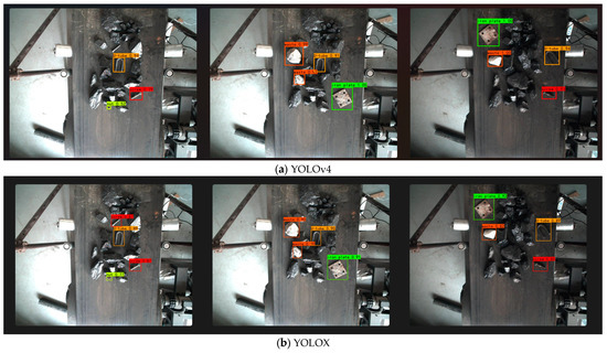 For the actual production and transportation process, the gangue was basically the same shape and size as the coal block, which is difficult to distinguish in the dim environment. By comparing the characteristics of the two, we found that the color brightness of the coal block was higher than that of the coal gangue. From Figure 11, it can be concluded that the overlapping degree between the prediction frame and the real frame of the coal block was more than 90%, and false detection was reduced. In this harsh and complex environment, the algorithm performance of this paper still showed a certain superiority, with high detection accuracy and detection speed, which could realize the conveyor belt foreign object detection under working conditions.