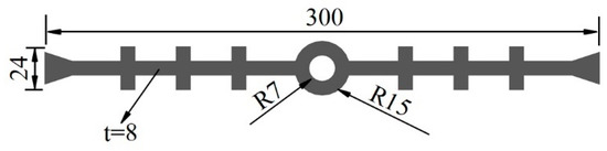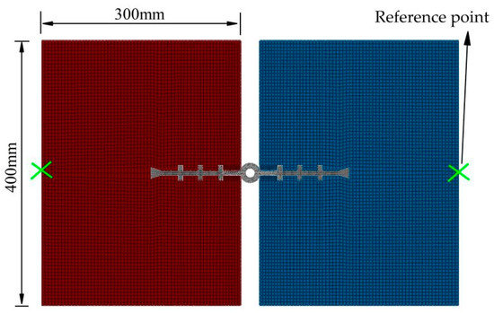 According to the adhesive force test of pure rubber and concrete test blocks, the normal adhesive force, tangential adhesive force, cohesive force parameters and so on were measured. In order to analyze the influence of water-stop hardness and the bonding force between the water-stop and concrete on its stress state, a finite element model of an embedded water-stop is established using the finite element software ABAQUS/Standard 2020. The embedded rubber water-stop is simulated using the Mooney-Rivlin model, with dimensions as shown in Figure 2. The concrete damage plasticity model is used to simulate the tunnel lining, considering the grade of the concrete as C30, the modulus of elastic as 30 GPa, and the Poisson’s ratio is 0.2. The concrete damage plasticity model in ABAQUS is used to simulate the failure of the lining. In the damage plasticity parameters, the eccentricity , the ratio of biaxial to uniaxial compressive strength , and the coefficient are set to 0.1, 1.16, and 0.667, respectively. Based on the implicit solution of ABAQUS, the viscosity parameter needs to be set to 0.005. The dilation angle is set to 30°. The stress–strain curves of concrete are determined according to the Code for the design of concrete structures [25]. The dimensions are 300 mm in width and 400 mm in height.