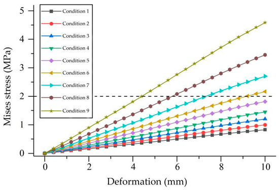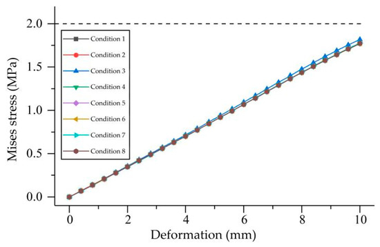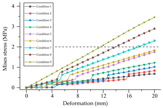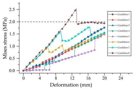 The calculation results of the water-stop deformation stress are shown in Figure 8, Figure 9 and Figure 10. The results show that: ① During tensile deformation, the deformation stress of the water-stop exhibits significant fluctuations after working condition 6, with the deformation stress first increasing and then decreasing. Before working condition 7, the deformation stress eventually tends to approximate values, while the deformation stress in working condition 8 shows a significant increase; ② During compression deformation, the deformation stress curves of each working condition are almost identical, indicating that the compression deformation is mainly due to the concrete lining squeezing the pores of the water-stop, which hardly destroys the bond between the water-stop and the concrete. The size of the bond strength between the water-stop and the concrete has little effect on the compression deformation stress of the water-stop; ③ During settlement deformation, the deformation stress of the water-stop does not show an obvious regularity with the change in bond strength before working condition 6, while after working condition 6, a clear regularity is observed, with the deformation stress increasing with the increase in bond strength.