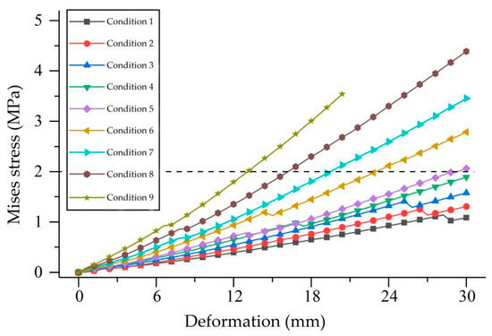 The waterproofing ability of water-stops depends on their surface contact pressure and bonding force. The contact pressure is difficult to change due to the structure; the waterproofing ability could be improved by increasing the bonding force of water-stops. To analyze the deformation and stress state of water-stops under different bonding forces, the bonding forces between rubber and concrete obtained from the tests are used as the basis, and different bonding forces are set, as shown in Table 2. A finite element model is established using ABAQUS/Standard, and the deformation is applied in the same way as described above.