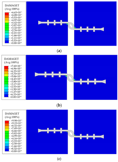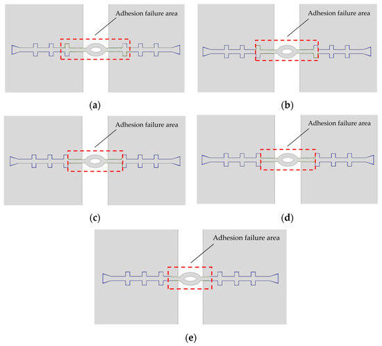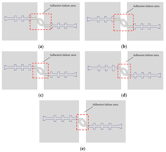 Bond failure area of partial working conditions in tensile deformation. (a) Working condition 4. (b) Working condition 5. (c) Working condition 6. (d) Working condition 7. (e) Working condition 8.