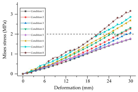 It can be concluded that after working condition 6, the bond strength between the water-stop and the concrete increases, and the bond failure range decreases (the bond of the water-stop ribs is not failed). In the process of stress, with the increase in deformation, the stress of the water-stop increases continuously before the bond failure between the wing plate and the concrete lining. Once the bond between the wing plate and the lining fails, the stress of the water-stop drops sharply, and then due to the next part of the bond not failing, the stress of the water-stop increases with the increase in deformation, and the change is more dramatic. Similarly, since the final stress is borne by the water-stop ribs after deformation, the stress of the water-stop deformation tends to be similar in all working conditions before working condition 7. In working condition 8, due to the excessive bond strength, the wing plate between the first water-stop ribs on both sides still bears the deformation, and the stress of the water-stop deformation is relatively large at this time.