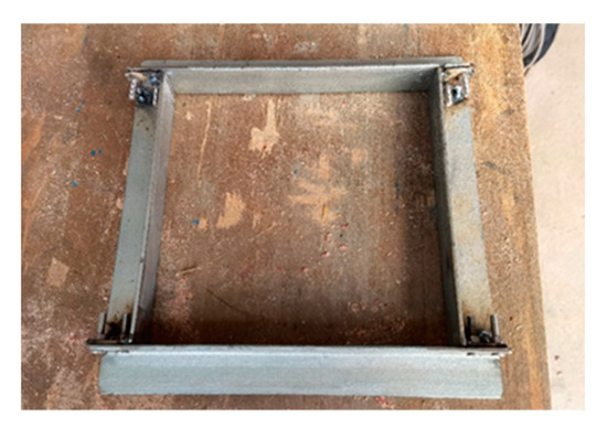 Each group of specimens mentioned above contains three tensile bond strength and three shear bond strength specimens, resulting in a total of 72 specimens for this experiment. To obtain rubber-cement specimens under different working conditions, as shown in Figure 13, rubber sheets with dimensions of 200 mm × 200 mm × 20 mm were purchased. Due to the fluidity of epoxy resin before solidification, it is difficult to control the amount and thickness when directly applying it to the rubber sheet. To facilitate the application of epoxy resin, a mold was fabricated, as shown in Figure 14, which was used to fix and wrap the applied surface.