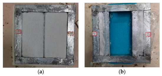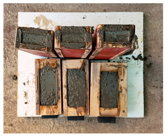 After the completion of the epoxy–quartz sand coating on the rubber blocks, cement casting was carried out on the tensile and shear surfaces, respectively. The weight ratio of cement, sand, and water was 1:5.27:1.25, as shown in Figure 17. The size of the cement test blocks was 100 mm × 50 mm × 20 mm.