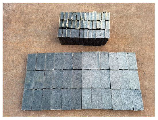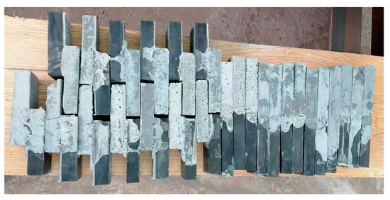 After the epoxy–quartz sand coating of the rubber-cement specimens was completed, the tensile bond strength test surface was a rectangular area of 50 mm × 20 mm, and the shear bond strength test surface was a square area of 50 mm × 50 mm. Once the specimens were cast, they were placed in an environment with a temperature of 20 ± 2 °C and a relative humidity of 95% or higher for 28 days of curing. Some rubber-cement specimens under various conditions are shown in Figure 18.
