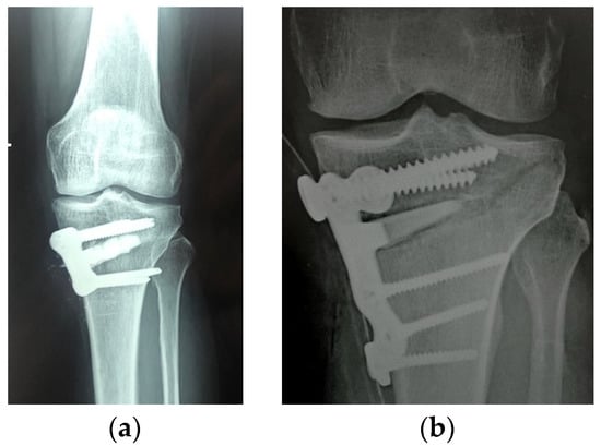 Synthetic biphasic ceramic (hydroxyapatite HA and beta tricalcium phosphate β-TCP) granules (a) vs. wedge (b) inserted into the high tibial osteotomy gap. The structural graft provides greater stability and strength to the construct.