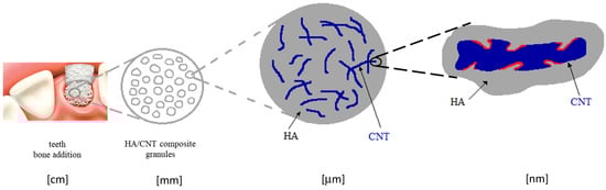 The mechanical properties of HA may be significantly improved by its reinforcing with carbon nanotubes (CNTs, 1–3 wt.%). Most of such applications concern dentistry applications [88]. The obtained properties were superior vs. the pure HA, such as the flexural strength, 83 MPa (1.6 times higher); and the fracture toughness, 2.4 MPa m1/2 (2 times higher), because of the special interface geometry between the matrix and the reinforcing element, schematically represented in Figure 6. The higher is the CNT roughness, the more efficient is the interlocking effect towards the HA particles whose properties are provided by the processing technology.