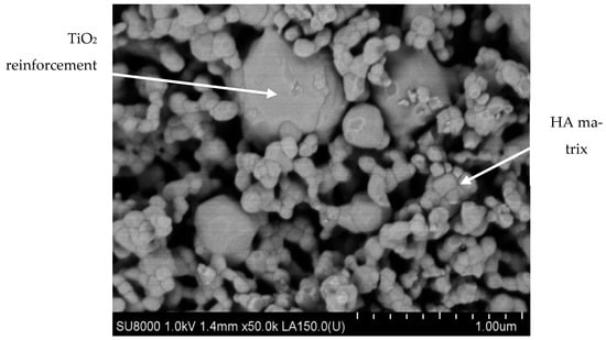 Recent research regarding advanced materials for alloplastic bone substitutes highlighted the PM biocomposites based on submicronic HA particles reinforced by titanium hydride micrometric powders (100–150 µm; 25% wt.) as the precursor. The TiH2 dehydrogenation reaction [89] occurring during the two-step sintering (TSS) treatment leads to the biocompatible TiO2-rutile allotropic phase synthesis [90,91], which acts as a reinforcement for the HA/TiO2 sintered biocomposite (Figure 7).