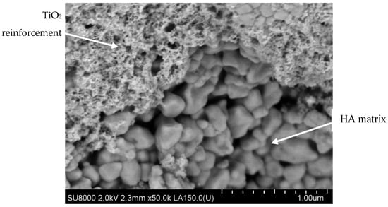 For the cortical bone tissue, BS applications could be manufactured by PM biocomposites obtained through spark plasma sintering (SPS) technology. The same dehydrogenation reaction mentioned above for HA/TiO2 composite is restricted by the compaction developing simultaneously with the sintering treatment, so the porosity is much lower (5–12%) than in the case of the same biocomposite made via TSS (Figure 8) [93].