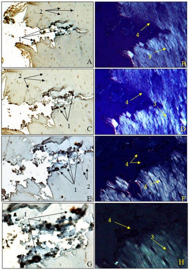 Bones, dentin and enamel have a similar composition to hydroxyapatite in the inorganic component as well as type 1 collagen and other proteins in the organic component but with different percentages [65,66]. The potential osteoinduction characteristics of the demineralized dentin matrix have been demonstrated in several studies, as well as the presence of bone-morphogenetic proteins in the human dentin matrix after a demineralization process [67,68].