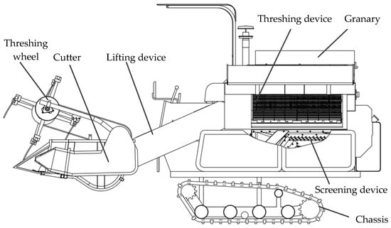 The 4LZ-4.0 prototype used in the test was developed together with the cooperative unit (Jiangxi Liangtian Agricultural Machinery Co., Ltd., Yingtan, China). The harvester consists of a chassis, threshing wheel, cutter, lifting device, threshing device, screening device, and granary, among other parts. The overall structure is shown in Figure 1, and the main operating parameters are listed in Table 1. The operation process is as follows: the rice enters the cutting table device under the guidance of the threshing wheel; the straw is cut off by the cutter and transported to the threshing device through the lifting device; the separation of the grain and the straw is completed in the threshing device; the grain is then cleaned by the screening device; and finally, it is transported to the granary for temporary storage, which completes the mechanized harvesting of rice.
