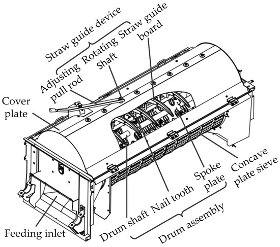 Rice is one of the most important grain crops in China. Harvest is an important process in rice production, and the mechanization of grain combine harvest is of great significance to improve the production efficiency, reduce the labor intensity, and reduce harvest loss. The threshing device is the core component of the grain combine harvester, and its working performance determines, to a great extent, the working quality and production efficiency of the harvester [1,2,3]. There are many directions of research on the threshing device, and it is complex. The structure parameters, operation parameters, and crop properties will all affect the threshing effect.