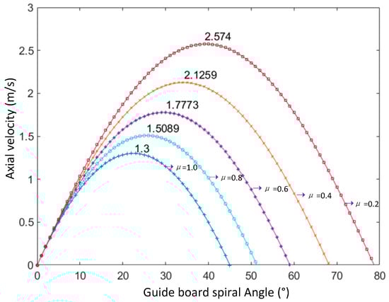 The axial transport of straw under different μ values was compared with the above model. According to some scholars [22,23], the crop humidity and friction coefficient myopia have a linear relationship; therefore, setting μ = 0.2 reflects the low moisture state of the straw, and setting μ = 1.0 reflects the high moisture state of the straw. The relationship between the spiral angle and the axial velocity of the straw particle is analyzed, and the corresponding curve is shown in Figure 5.