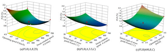 Figure 7 shows the response surface and contour plot for the PLR. As can be seen from Figure 7a,b, the PLR tends to decrease with increasing drum rotation speed (A). This is because as A increases, the impact force of threshing teeth on the straw increases, the probability of impact per unit of time also increases, the grain on the straw is easier to be depurated, and the entrainment loss decreases. As can be seen from Figure 7a,c, the PLR first decreases and then increases as the operating speed (B, the corresponding feeding amount) increases, the number of straws entering the threshing drum per unit time is smaller, the rubbing action between straws is weakened, the grain is not sufficiently threshed, and the PLR increases. In contrast, when the operating speed is high, too much straw is fed into the threshing drum per unit of time, the entrainment loss increases, and the PLR also increases. As can be seen from Figure 7b,c, the PLR tends to increase gradually with an increasing spiral angle of the straw guide board (C), the time of straw threshing in the threshing drum is shortened, and the PLR increases if the grain is not completely threshed.