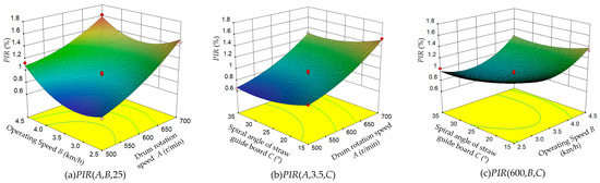 For the PLR interaction terms, the order of influence is operating speed × spiral angle of straw guide board > drum rotation speed × spiral angle of straw guide board > drum rotation speed × operating speed. For the PIR interaction terms, the order of influence is drum rotation speed × operating speed > operating speed × spiral angle of straw guide board > drum rotation speed × spiral angle of straw guide board. For the PBR, the order of influence on the interaction terms was operating speed × spiral angle of straw guide board > drum rotation speed × spiral angle of straw guide board > drum rotation speed × operating speed.