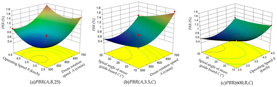 Figure 9 shows the response surface and contour plot of the PBR. As can be seen from Figure 9a,b, the PBR tends to increase with increasing drum rotation speed (A) because the impact force of the threshing teeth on grains increases with an increase in the drum rotation speed (A), and the grain is easily broken, resulting in an increased PBR. As can be seen from Figure 9a,c, the PBR first decreases and then increases with increasing operating speed (B, corresponding feeding amount), and the probability of grains being crushed by the threshing teeth is high, resulting in a high PBR. On the other hand, when the operating speed is high, the threshing roller has more grains, thus more grains are hit by the threshing teeth, and the PBR is large. As can be seen from Figure 9b,c, there is a decreasing trend in the PBR with an increasing spiral angle of the straw guide board (C). That is because the time of straw threshing in the threshing drum is shortened, the time of grain beating is reduced, and the PBR is reduced.